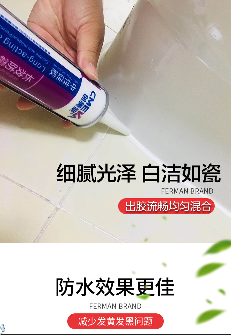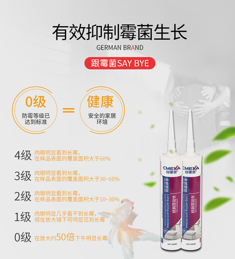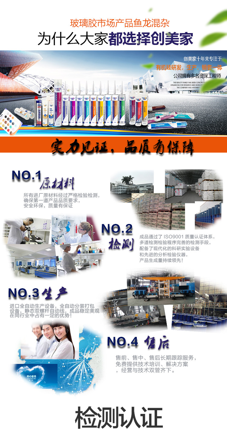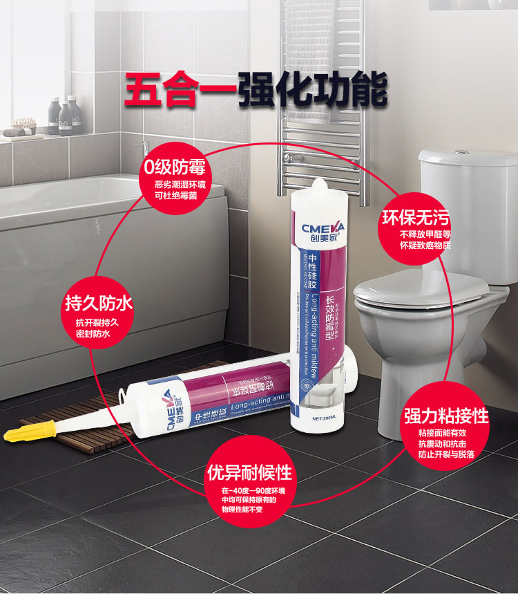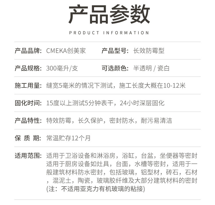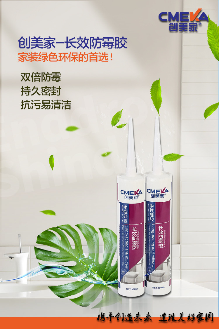 1、創(chuàng)美家長(zhǎng)效防霉系單組份、中性防霉型、室溫固化硅酮玻璃膠,使用方便。